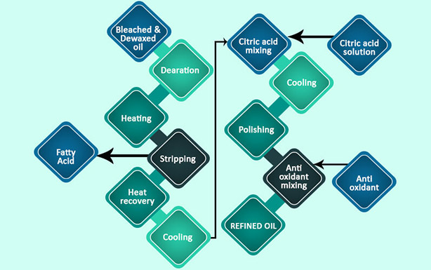 La désodorisation aide à éliminer de nombreuses odeurs et couleurs indésirables dans l'alimentation. La désacidification avec désodorisation est effectuée à 230 – 250°C sous un vide poussé de l'ordre de 1,5 torr avec vapeur de barbotage pendant environ 60 minutes. Cela rend l'huile exempte de composés odorants et d'acides gras libres.