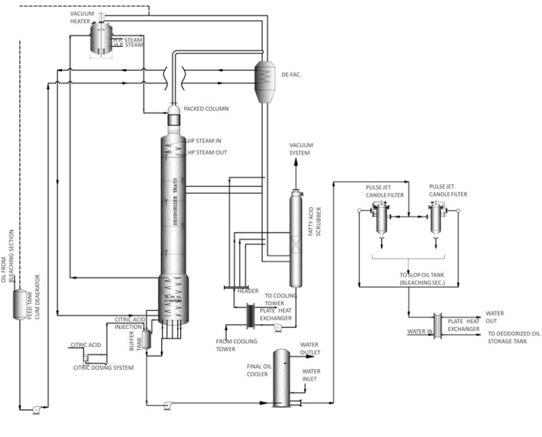 La désodorisation est un processus de stripage sous vide dans lequel une quantité donnée d'un agent de stripage (généralement de la vapeur) est passée pendant une période donnée à travers de l'huile chaude à basse pression. Il s'agit donc principalement d'un processus physique dans lequel divers composants volatils sont éliminés.