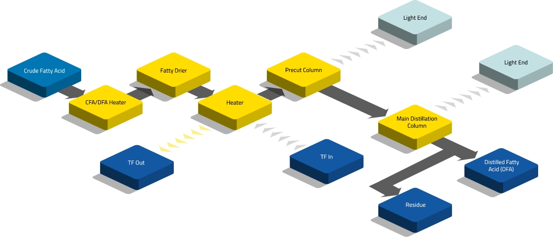 Les usines de production d'acides gras peuvent produire de grandes quantités d'acides gras à un coût inférieur à celui de leur achat auprès de sources externes, car le procédé de distillation fractionnée est conçu à cet effet.